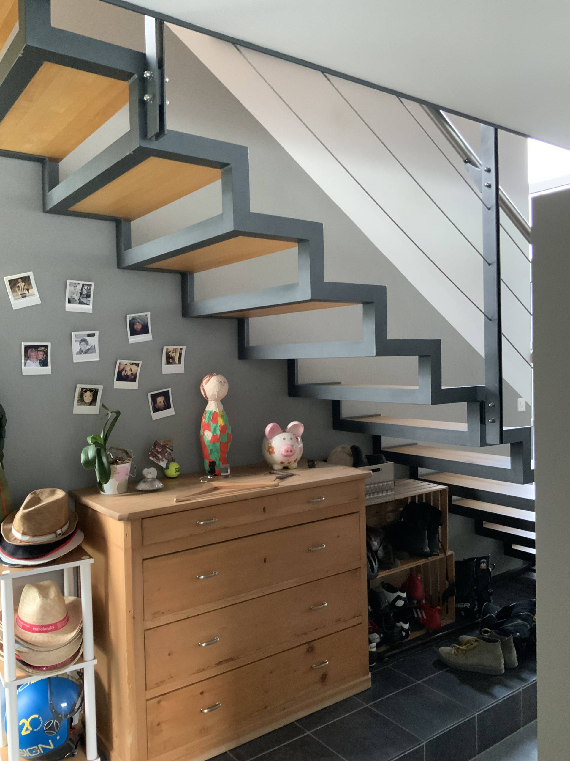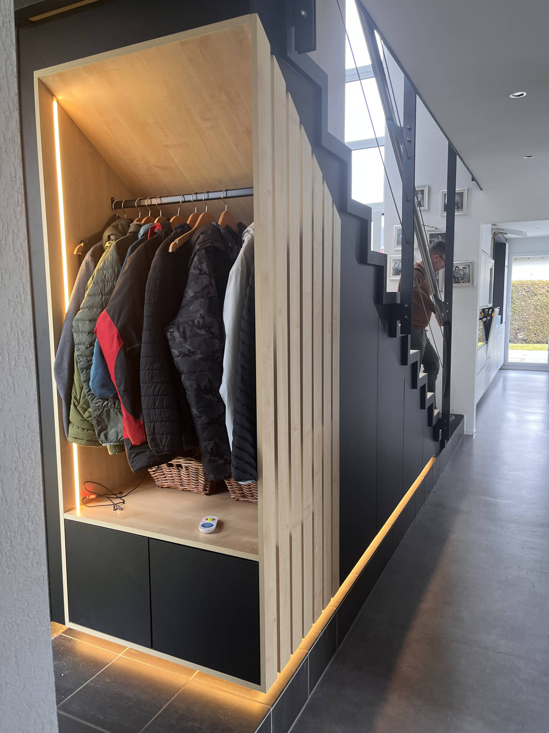Sous l’escalier, souvent laissé inutilisé, nous avons imaginé et réalisé un aménagement sur mesure, à la fois esthétique et ultra fonctionnel :